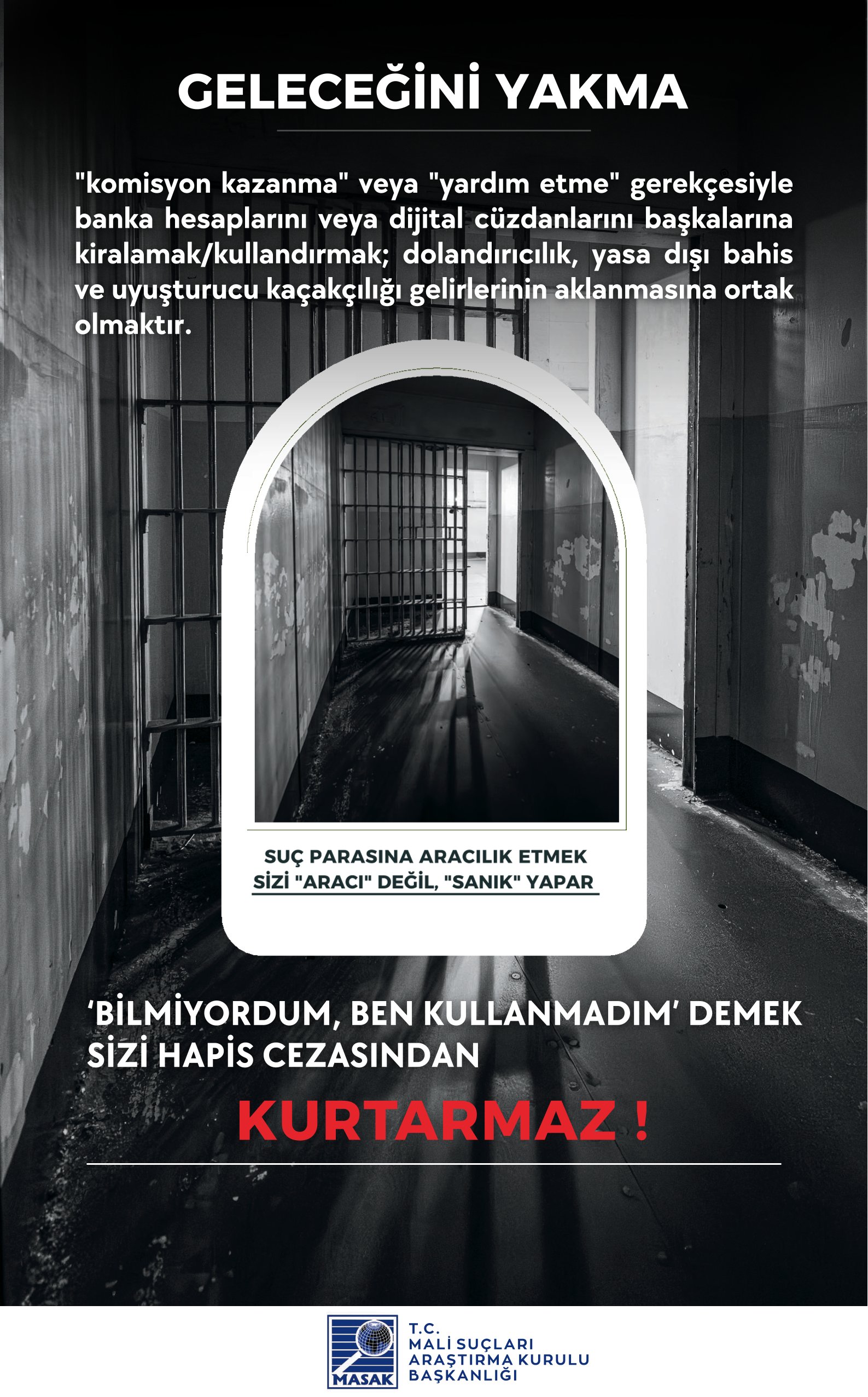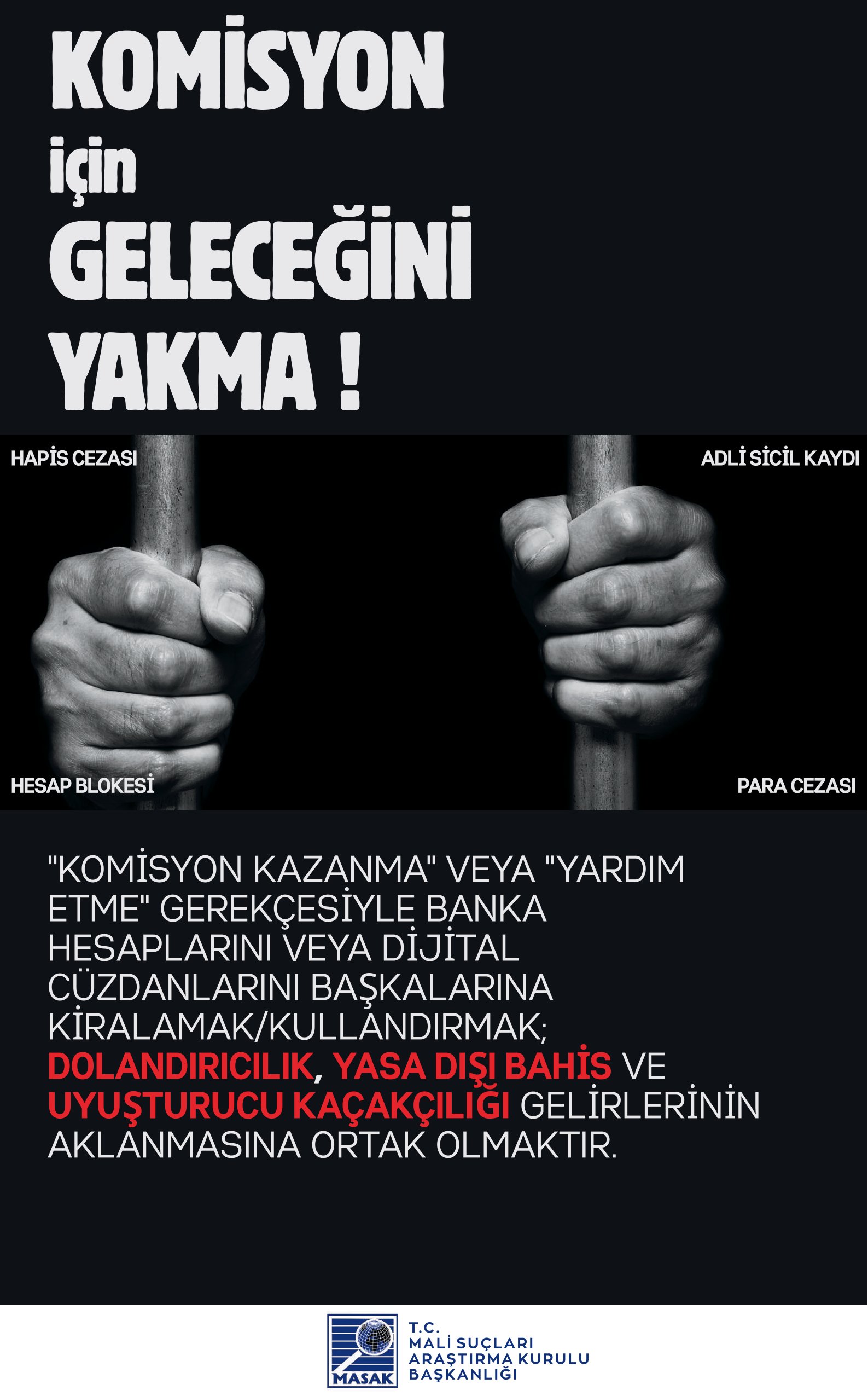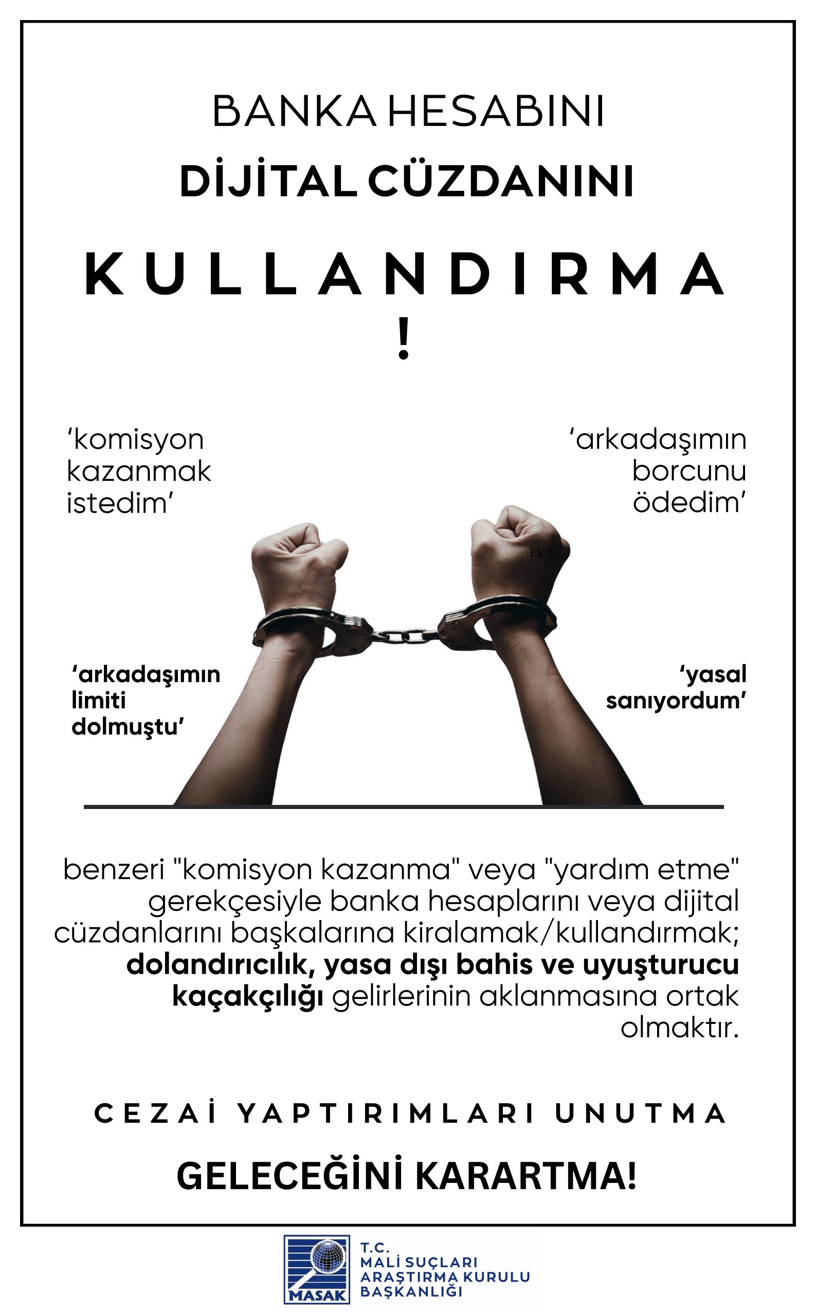 Kendi adınıza kayıtlı banka hesaplarınızın veya dijital cüzdanlarınızın; “komisyon kazanma”, “borç ödeme yardımı”, “sadece bir kez kullanma”, “zararsız para transferi” veya benzeri gerekçelerle başkaları tarafından kullanılmasına bilerek ve isteyerek izin verilmesi, Türk Ceza Kanunu ve ilgili mevzuat kapsamında cezai ve hukuki sorumluluk doğurabilir. Hesaplarınız üzerinden gerçekleştirilen işlemlerden, işlemi fiilen yapan kişi kim olursa olsun, hesap sahibi olarak siz sorumlu tutulabilirsiniz.